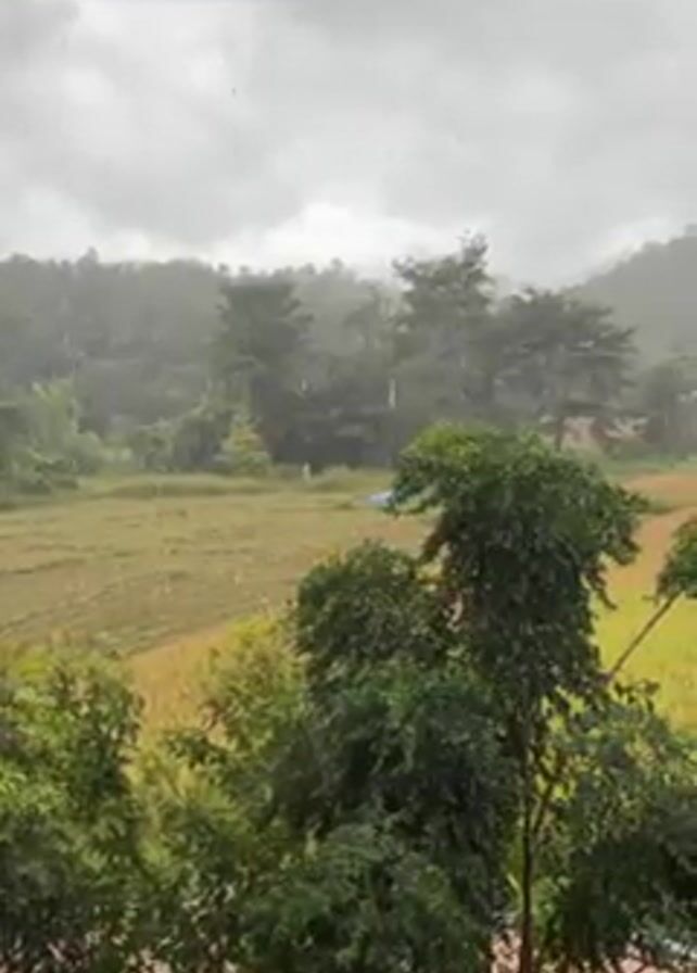 From a roof overhang, the video shows a light rainfall over a rural landscape. Golden rice paddies stretch across the view, interspersed with green trees and glimpses of houses. A forested hill rises in the background under an overcast, grey sky. The rain falls evenly across the scene.