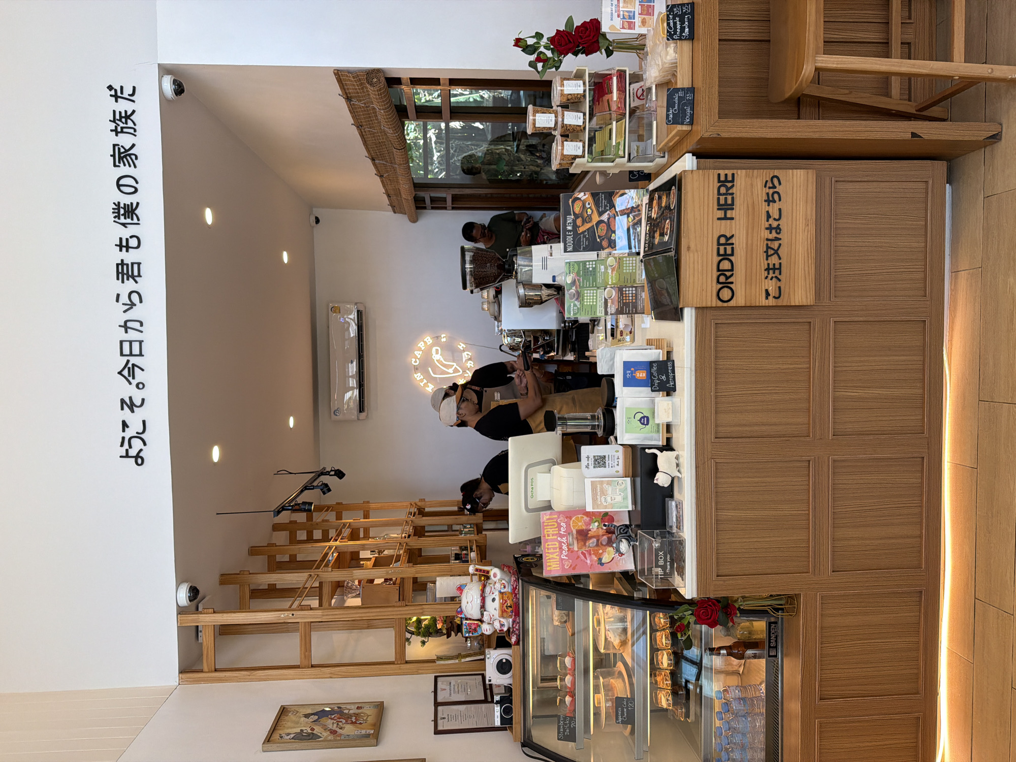 The image depicts the interior of the "KIN CAFE" located in Kathu, Thailand, viewed from a customer's perspective facing the service counter. In the foreground, a light-colored tiled floor is visible. The primary subject is a wooden service counter with a white countertop. On the left, a glass refrigerated display case contains various pastries, including "Strawberry Daifuku" (70฿) and "Japanese Cheese Cake" (120฿), and bottled beverages. Above this case, a large Maneki-neko (beckoning cat) figurine, two vintage cameras (a silver and a black one), and framed certificates are displayed. A framed artwork hangs on the adjacent wall. The central part of the counter features a Point-of-Sale (POS) system (labeled "Ocha POS"), a clear "TIP BOX - Thank you," and various menu cards, including "MIXED FRUIT Peach Tea," "NOODLE MENU," "MATCHA UJI," and "BREAKFAST SET." Behind the counter, two individuals are present: one male barista wearing an apron and cap is operating coffee equipment, while another individual, also in an apron, is partially obscured behind the counter. A neon sign spelling "KIN CAFE" in English and Thai script is visible on the back wall. Coffee equipment, including a grinder and an espresso machine, is also present behind the counter. To the right of the central counter, a small display unit holds packaged snacks such as crackers (25฿), nougat (25฿), and cookies (35฿, flavors pineapple and strawberry). A glass vase containing three red roses is positioned near these items. A wooden stool is placed adjacent to the right side of the counter. The front of the counter displays a sign that reads "ORDER HERE" in English and "ご注文はこちら" in Japanese. The background consists of white walls. A large wooden shelving unit with a grid-like structure is visible on the left. Above the service area, an air conditioning unit is mounted, and recessed spotlights illuminate the space. Two dome-style security cameras are affixed to the ceiling/wall junctions. High on the back wall, large black Japanese characters read "ようこそ。今日から君も僕の家族だ" (Welcome. From today, you are also my family.). A window on the right side of the frame features a rolled-up bamboo blind and reflects the image of a person and green foliage from outside.