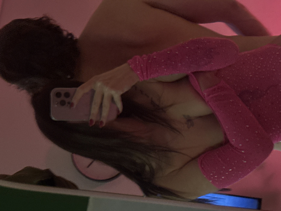 A woman takes a mirror selfie. She wears a form-fitting, long-sleeved pink dress with subtle embellishments. She holds a phone with a multi-lens camera, her manicured hand visible. Part of her chest is shown, including a couple of small tattoos. Her long, dark hair cascades around her face. The background appears to be a dimly lit room. The image is reflected in the mirror.
