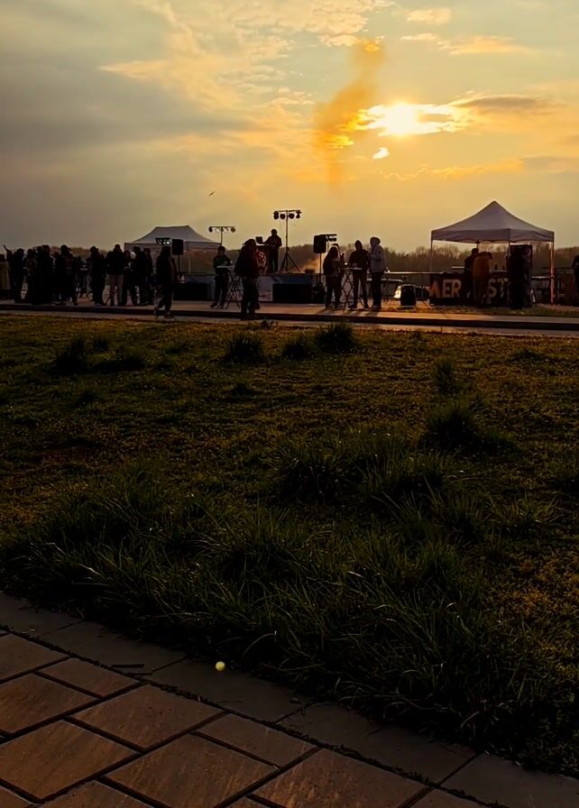 The video captures a live music event outdoors at sunset