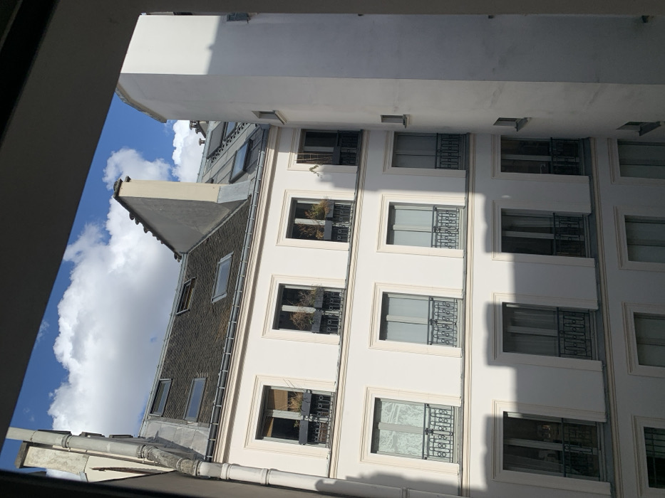 The image depicts an urban architectural scene viewed through a window frame, characteristic of a Parisian cityscape. The primary subject is a multi-story building, likely an apartment block, with a light-colored, possibly off-white, stucco or stone facade. The building features a dark grey mansard roof adorned with multiple rectangular skylights and traditional dormer windows. A prominent, light-colored chimney structure rises vertically from the mansard roofline on the right side of the main building section. A vertical metal downspout runs along the far left edge of this structure. The building's facade presents several rows of rectangular windows. On the upper floor, some windows are equipped with dark-colored planter boxes containing visible, somewhat sparse vegetation. Below this, subsequent floors feature windows with ornate, dark-colored wrought-iron balconettes. Some windows reveal interior blinds or curtains. To the immediate right, a plain, tall, white building wall forms a sharp corner, indicating a narrow space or courtyard between structures. This wall exhibits a few small, recessed square openings. Beyond the main building's roof, another building's roofline with additional skylights is partially visible. Above the rooftops, a bright blue sky with scattered white cumulus clouds is present. Natural sunlight illuminates the scene, casting distinct shadows from the adjacent building onto the main facade, particularly on the lower levels. No individuals or active elements are discernible within the frame. The architectural style, including the mansard roof and balconettes, firmly places the location within the city of Paris, France.