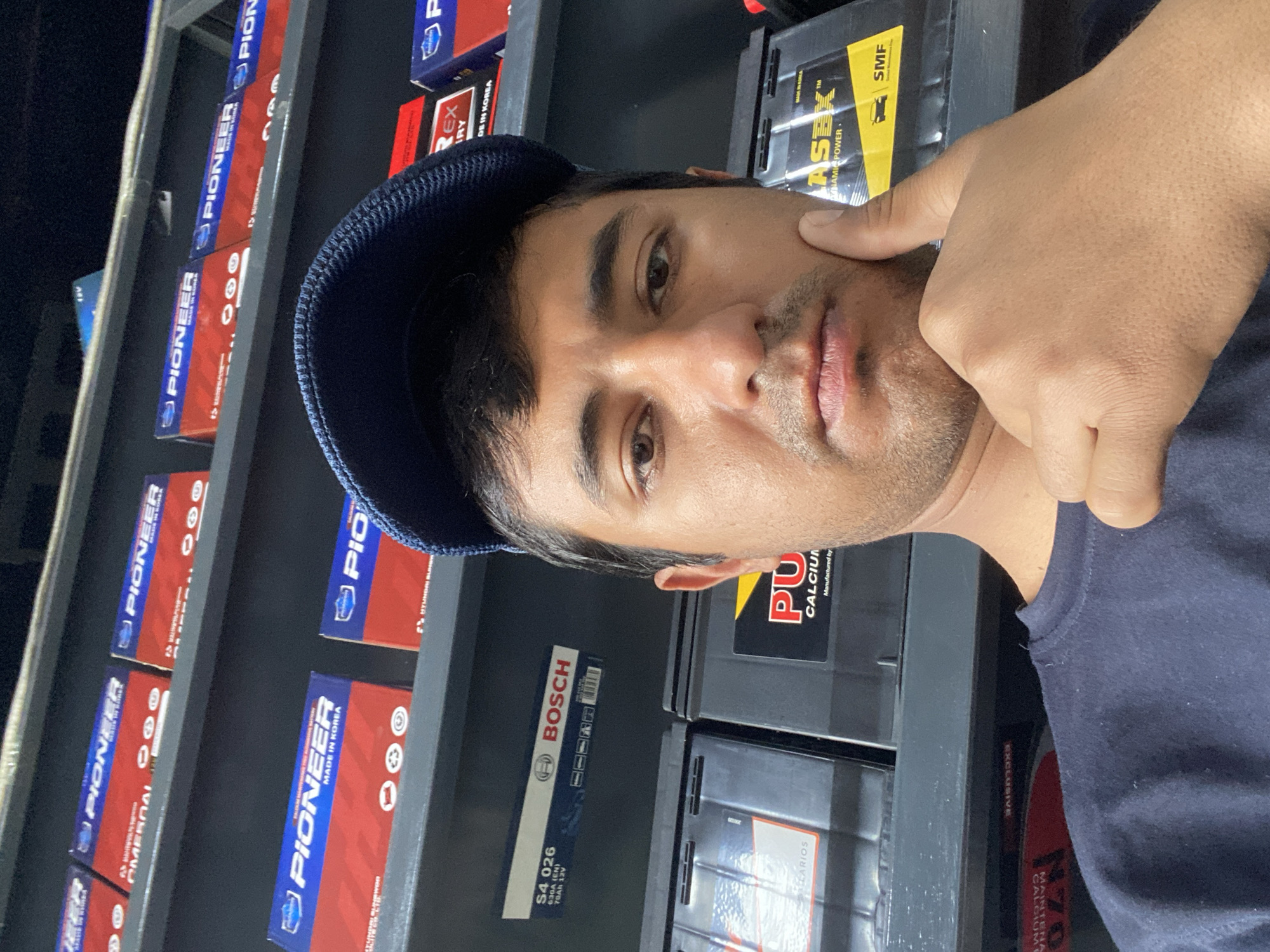 A male subject is captured in a close-up, self-portrait photograph within an automotive battery store in Bukhara, Uzbekistan. The subject, an adult male with dark hair, dark eyes, and facial stubble, wears a dark blue peaked cap and a dark blue crew-neck shirt. He is positioned centrally, looking directly forward, with the thumb and index finger of his right hand resting on his lower jawline. The background features industrial-style dark gray metal shelving units populated with numerous automotive batteries and their packaging. Prominently displayed brands include 'PIONEER' on red and blue boxes, a 'BOSCH S4 026 70Ah 12V' battery, 'REX BATTERY', 'PUMA CALCIUM', and 'ASEX DYNAMIC POWER SMF' batteries. Several labels indicate 'MADE IN KOREA'. The setting is an interior commercial space specializing in vehicle power solutions.