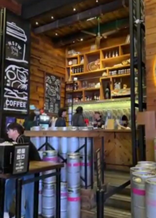 interior of a coffee shop. Several people are standing around the counter. The walls are paneled in wood, and there are shelves filled with bottles and decorative items. Several silver kegs with pink stripes are stacked next to tables. A chalkboard menu is visible on the wall.