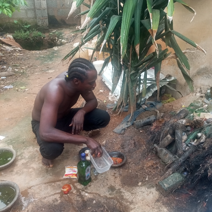 An adult male, dark-skinned, shirtless, and barefoot, wearing black pants, is squatting outdoors on reddish-brown earth. His hair is braided with yellow ties. He is actively pouring white, lumpy contents from a clear plastic rectangular container into a dark, shallow bowl containing a reddish, semi-solid substance. Adjacent to this, a green glass bottle and a white packet with red lettering lie on the ground, along with a piece of red fruit or vegetable. To the left, two similar dark bowls each hold a dark green liquid. The immediate environment includes patches of damp earth. In the background, a large leafy plant with browning tips stands next to a significant pile of refuse, comprising numerous glass bottles, charred debris, and ashes, indicative of burning. Further back on the left, a muddy pit with sparse green vegetation is visible, backed by a concrete block wall. The far background shows a light-colored building wall. The scene is located in the city of Unknown, Unknown.