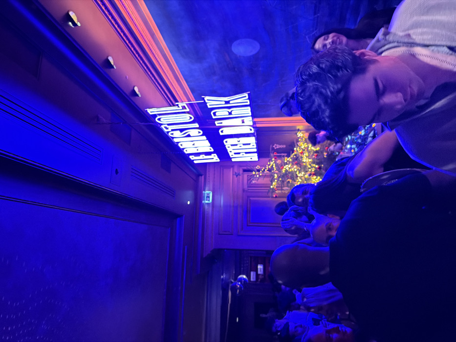 An angled shot shows a crowded indoor scene with a neon sign reading "BRISTOL THE DARK" mounted near the ceiling. People are tightly packed, with a few faces visible amongst dark clothing. A Christmas tree with lights is situated in the background, indicating a festive atmosphere. The lighting is predominantly blue, with some warm tones emanating from the tree. Architectural details like a door and wall paneling are also visible.