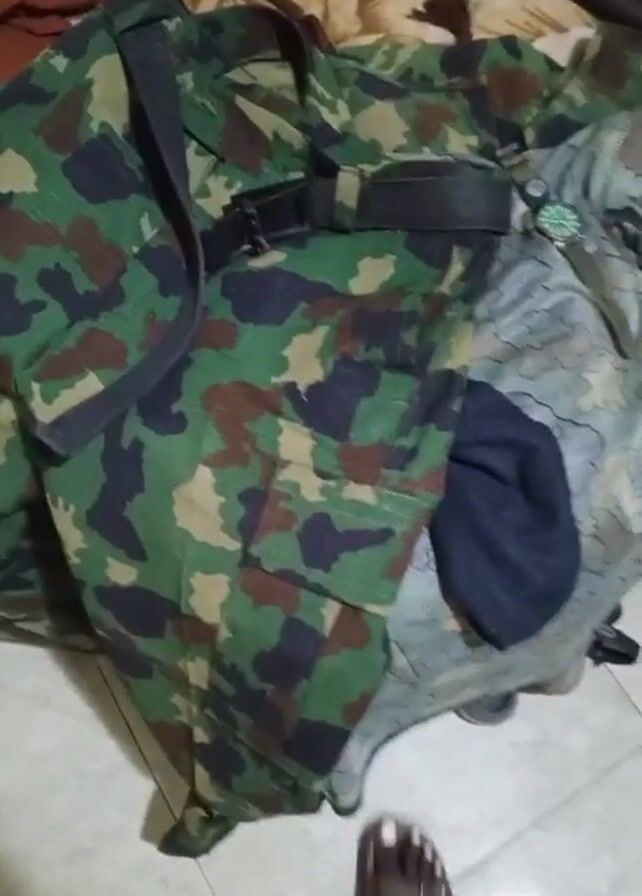 close-up view of items laid out on a bed with a floral patterned bedspread. The primary focus is on a camouflage military uniform, complete with a dark belt and attached shoulder strap. Next to the uniform is a dark blue beanie and what appears to be a wristwatch. Lying across the top of the bed, extending into the upper right corner, is a black rifle with a strap. A brown garment is visible on the left side of the bed. Part of a person's foot is briefly visible at the bottom of the frame. The camera moves slightly during the video, providing different angles of the items on the bed. The environment appears to be indoors, likely a bedroom.