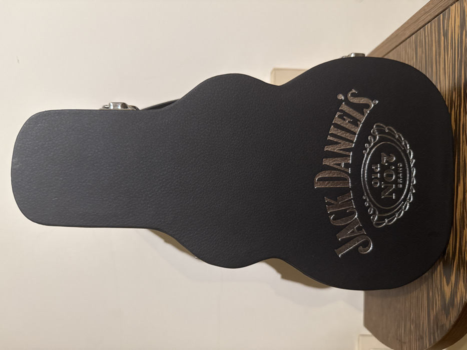 A black, guitar-shaped hardshell case stands upright on a light-colored wooden surface, which displays a distinct wood grain pattern. The case's exterior is dark, exhibiting a fine granular texture, suggestive of synthetic leather or a similar material. Emblazoned on the lower portion of the case, in silver-colored metallic text, is the "JACK DANIEL'S" logo. Below this, an ornate silver oval border encircles the text "Old No.7 BRAND". Partially visible along the right edge of the case are two silver-toned metal latches. The background consists of a plain, light-colored wall, casting a soft shadow from the case. No individuals, animals, or additional significant objects are present. No actions or interactions are depicted. The image does not contain any discernible visual information to identify its specific location within the city of Sofia, Bulgaria.