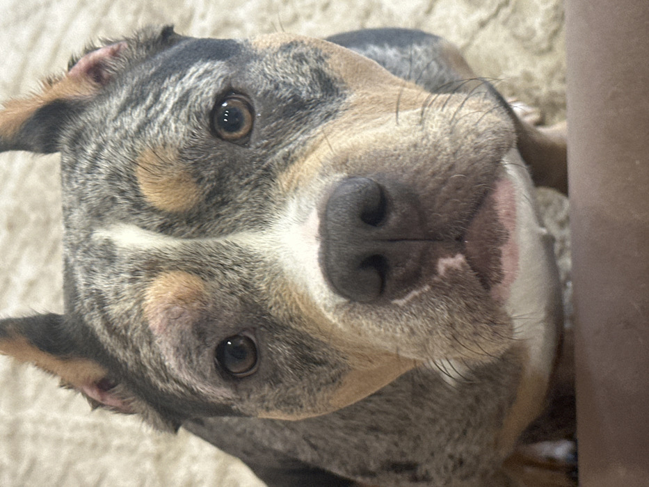 - "The image displays a close-up, frontal view of a domestic canine, consistent with an American Bully type, situated indoors" by FM-3Fotg1, licensed under CC BY 4.0