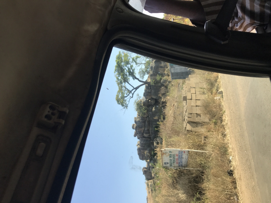 The image depicts an exterior view from within a vehicle, capturing a rural or semi-rural landscape in Vom, Nigeria