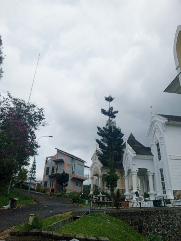 A cloudy sky looms over a scene with diverse architecture and vegetation. A gray and orange house sits on a hill beside a road. A tall pine tree stands beside a white building with ornate, arched windows and pointed roofs, suggesting a church or temple. A lamp post stands along the road, near a cluster of flowering trees, adding a touch of nature to the developed area.