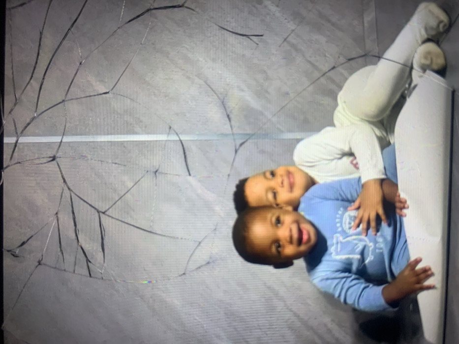 The image depicts two children positioned on a light-colored surface against a textured gray background, in the city of Ijegun, Nigeria. The image itself is presented through a heavily cracked surface, displaying numerous radial and linear fractures across its entirety, along with some pixelation and vertical color aberrations. The primary subjects are two children, likely of African descent. The child on the left is younger, appearing to be a toddler, with dark skin and short dark hair. This child is seated upright, facing directly forward, wearing a light blue long-sleeved top featuring a white graphic of an animal and text, along with matching blue pants. The child has a broad, open-mouthed smile. The child on the right appears older, possibly between three and five years of age, also with dark skin and short dark hair. This child is positioned behind and to the right of the younger child, lying on their left side and propped up, looking towards the left with a subtle smile. They are dressed in a light-colored, possibly white or cream, long-sleeved top and matching pants or leggings. The older child's right arm is placed around the waist of the younger child, indicating an embrace or close interaction. In front of the children, a white, elongated, curved object rests horizontally, partially obscuring their lower bodies. The background consists of a light gray, possibly paneled, textured surface.