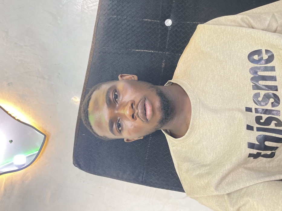 A forensic description of the scene in Unguwar Gabas, Nigeria, reveals a frontal portrait of a young adult male, seated indoors. The individual, of African descent, possesses short dark hair, a trimmed beard, and a neutral facial expression with slightly parted lips, looking directly at the viewer. He wears a light beige long-sleeved sweatshirt with the word "thisisme" printed in black capital letters across the chest. The subject is positioned in front of a dark, likely black, textured upholstered surface, possibly a chair back or headboard, which features two visible white circular studs. Above and behind the individual, affixed to a light grey wall, is an irregularly shaped, reflective decorative object, possibly a mirror, with integrated lighting. This lighting source emits a warm yellow-orange glow and a bright white light, with a distinct green light reflection visible on the subject's forehead and hair.