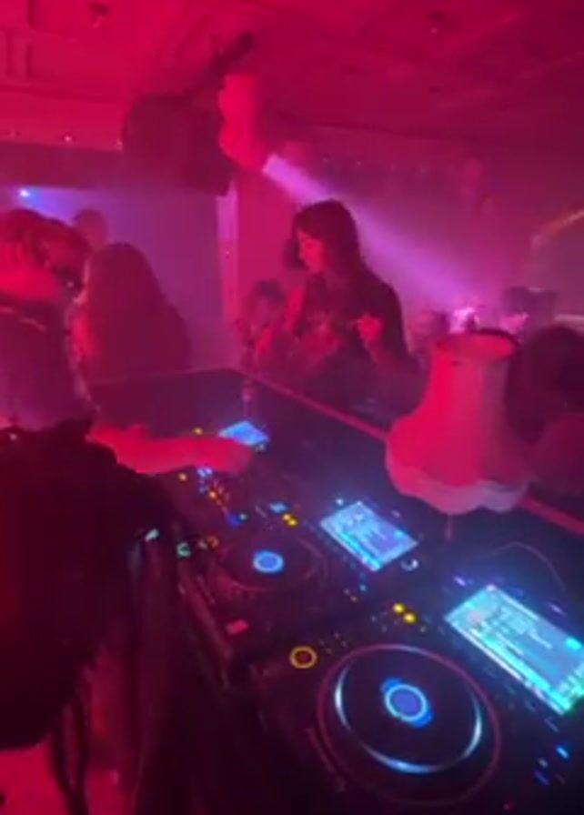 DJ playing music at a crowded nightclub. The DJ is operating a Pioneer DJ system, with multiple decks and screens visible. The club is illuminated by red lighting and features a decorative lamp on the DJ booth. People are dancing in the background. The club has a coffered ceiling. There is a speaker hanging from the ceiling.