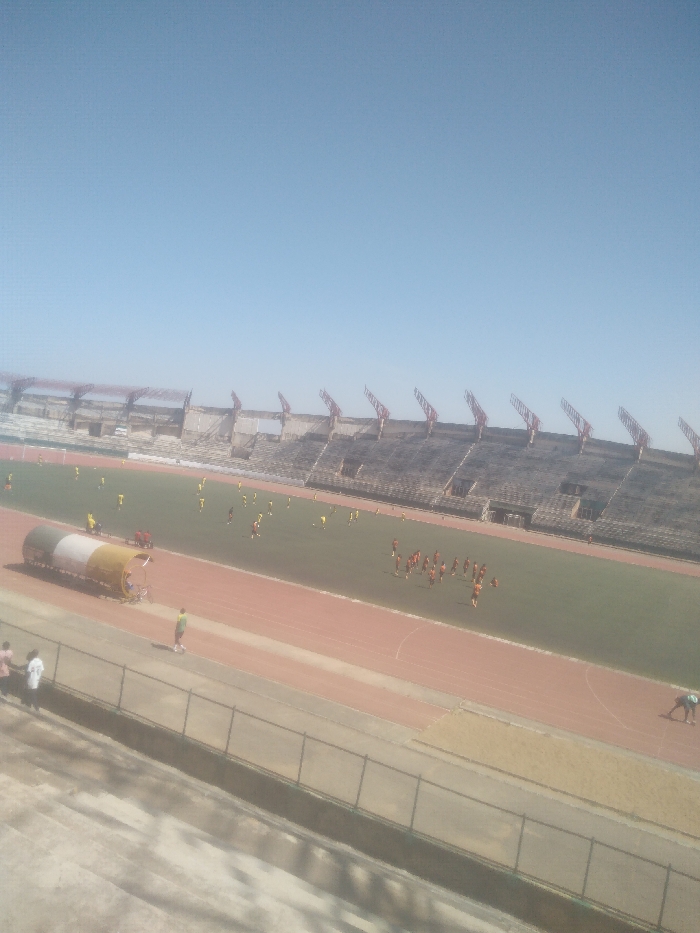 This image depicts a wide view of a large, outdoor sports stadium under a clear, light blue sky on a sunny day. The location is the New Stadium, Nigeria. The stadium features extensive multi-tiered concrete spectator stands, predominantly empty, spanning the background from left to right. Above the stands, structural elements and what appear to be frameworks for canopies are visible. In the mid-ground, a green grass football pitch is encircled by a reddish-brown athletic running track. On the football pitch, two distinct groups of individuals are present. One group, numbering approximately 10-15 people wearing yellow or light-colored shirts, is scattered across the left side of the pitch, appearing to be engaged in a training session or warm-up. Another group of approximately 15-20 individuals, dressed in red or orange shirts, is clustered together on the right side of the pitch, also seemingly in a training formation. Adjacent to the running track on the left side of the image is a large, elongated dugout or covered shelter with a light-colored top and a yellow/brown base. In the foreground, a dark metal fence runs horizontally across the lower part of the frame, separating the viewing position from the track area. On the running track, one individual in a light green shirt stands alone, facing left. Further to the right on the track, another individual is bent over. In the bottom-left corner, behind the foreground fence, two individuals are partially visible, one wearing a white shirt. The overall scene suggests a practice or training session within a large, somewhat aged stadium setting.