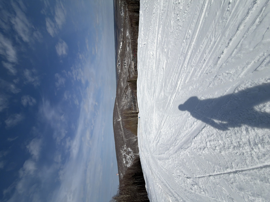 The image displays a wide, snow-covered ski slope at the Gubakha Ski Resort in Gubakha, Perm Krai, Russia. In the foreground, an elongated, dark gray shadow of a person, presumably the photographer, is cast upon the packed snow, which is marked with numerous parallel ski or snowboard tracks. The midground reveals the broad, descending ski run, bordered on the left by a dense cluster of bare deciduous trees. A small blue marker post is visible on the snow further down the slope. The background consists of rolling, partially snow-dusted hills covered with sparse, bare trees. A distinct red-and-white striped tower stands atop a distant ridge to the left. The sky, occupying the upper portion of the frame, is clear blue with scattered white, wispy clouds, indicating bright daylight winter conditions.