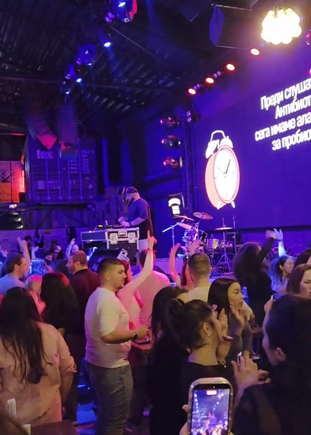 Okay, here is a detailed description of the video: The video shows a crowded indoor space, possibly a bar or club, with people dancing and cheering. A DJ is on stage, operating equipment while a drummer plays behind him. The lighting is dark, with bright spotlights and color washes illuminating the space. A large screen in the background displays a graphic of a red alarm clock with text in a language other than English, possibly Bulgarian. Many people in the crowd are holding drinks or phones, and several are recording videos. The environment appears festive and lively. Metal bars support the ceiling of the club. A logo for a beer brand can be seen on the far right.