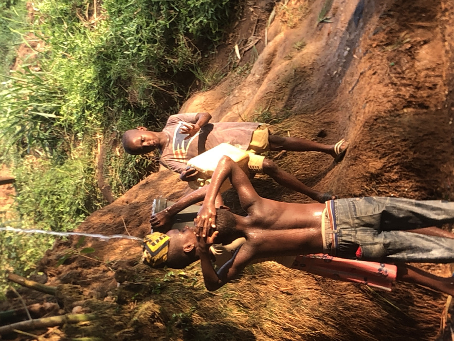 The image depicts three individuals, likely children or youth, at a water collection point in the city of Unknown, Unknown