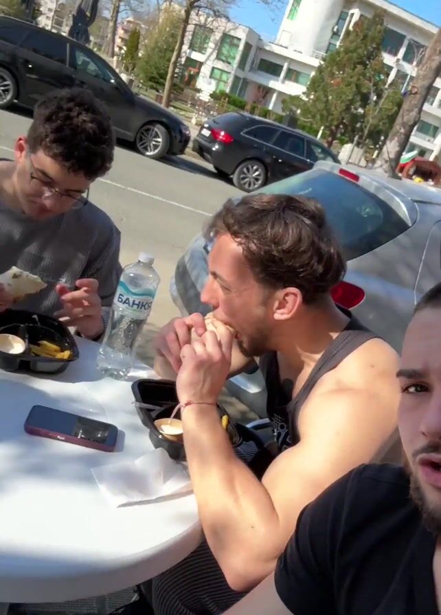 The video depicts two separate scenes. The first scene features two men sitting outside. One man is eating what appears to be a wrap or sandwich. A gray car is parked behind them. The second scene transitions to a table where three people are eating. Each person has a container of food and their phones are visible on the table. A water bottle sits in the center. The final portion of the video is a close-up of a man with a beard, possibly one of the men from the earlier scenes. He is outside with a tree and street signs visible in the background. He speaks to the camera and smiles.