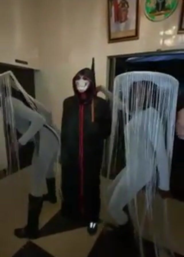 Three people in Halloween costumes stand in a room with a black and white checkered floor. The person in the center wears a black hooded robe with red trim and a white skull mask. They hold a dark object, possibly a prop scythe. The people to either side are in white outfits with what appears to be white netting material partially obscuring them. They all stand still, facing the camera. Behind them are two framed pictures hanging on the wall. One picture appears to be a portrait of a man. There are two doorways visible in the background, one to each side.