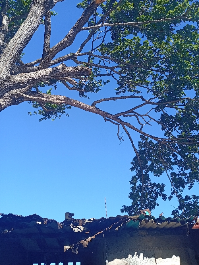 A large tree, with thick branches extending across the frame, dominates the upper portion of the image. Its leaves are green and dense. Below, a weathered roof with rusted corrugated metal and damaged sections covers an unseen structure. A thin antenna rises vertically from the roof. The sky is clear and blue, filling the space between the tree branches and the roofline.