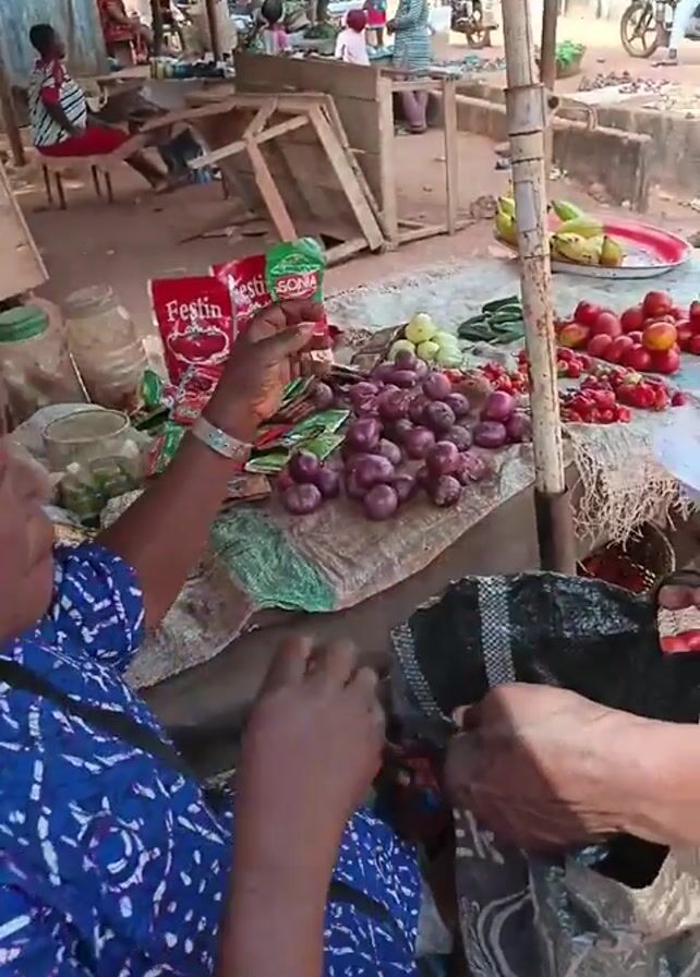 bustling outdoor market scene. Two people are visible at a vegetable stand. A woman in a blue patterned top is putting vegetables into a black plastic bag. A person wearing a shirt patterned with lions is handling money. The stand has tomatoes, red onions, bananas, and other vegetables. There are also packets of tomato paste on display. In the background, there are other stands and people, and a person on a motorcycle is driving past. The scene is shot under a canopy.