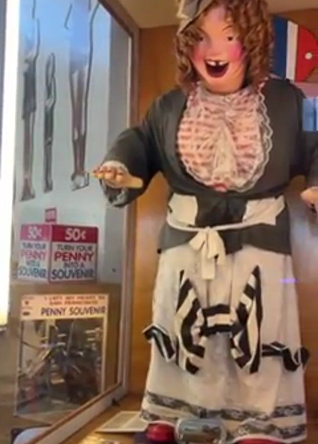 Laughing Sal animatronic figure in a display case inside an arcade or museum
