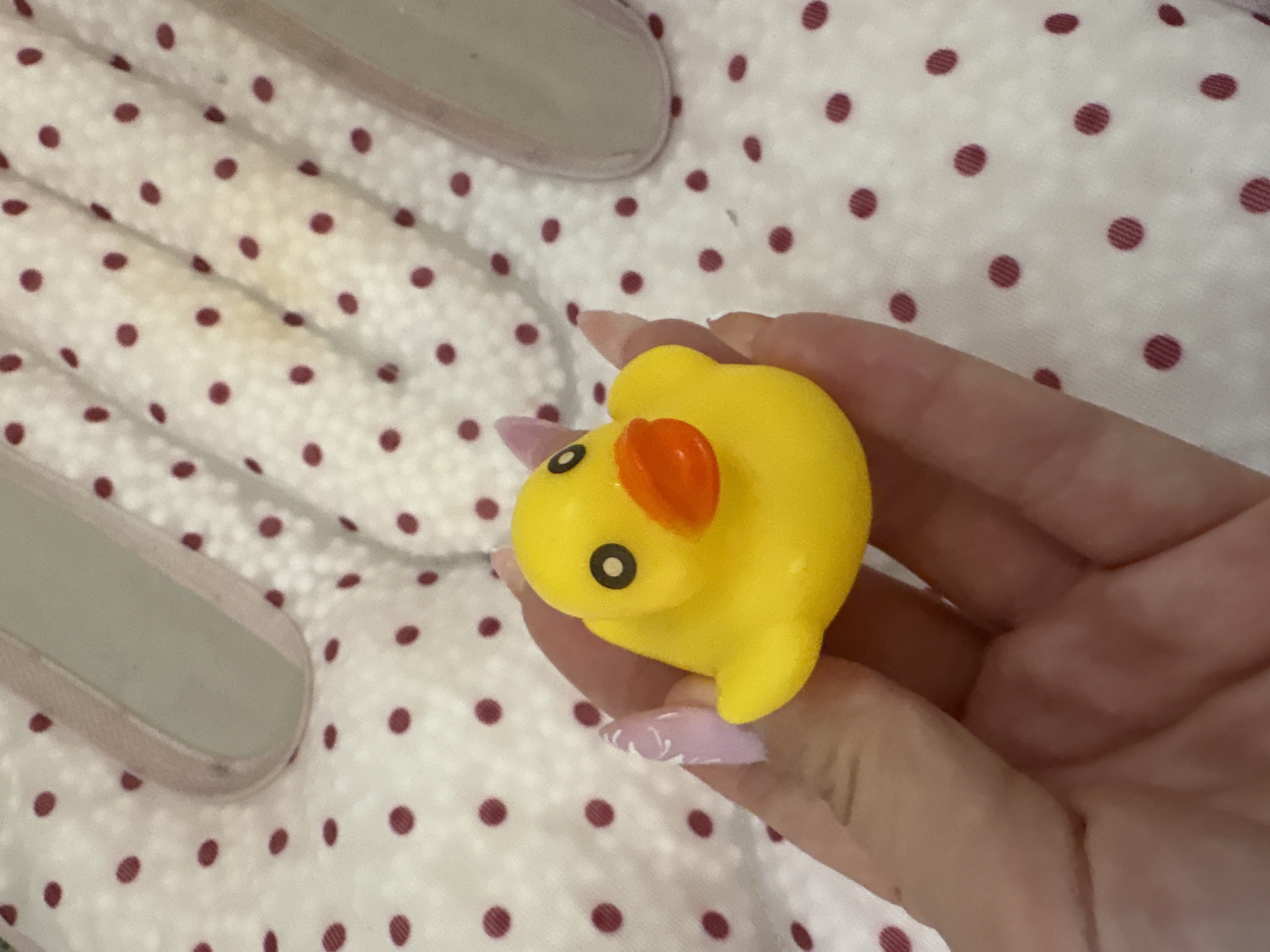A hand holds a yellow rubber duck with an orange beak and black eyes. The background is a white fabric with burgundy polka dots. Two pink objects, likely shoes or accessories, are partially visible in the upper left corner. The location is unknown and cannot be determined to be Bogdan, Bulgaria from this image.