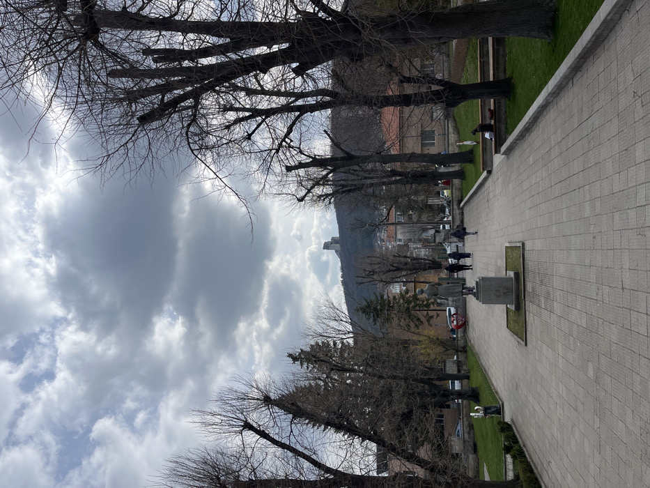 An outdoor, eye-level photograph captures a paved pedestrian walkway in Shumen, Bulgaria, extending into the midground under an overcast sky. The sky features patchy grey clouds with brighter areas. Deciduous trees, mostly bare and heavily pruned, line both sides of the walkway, with a few taller, unpruned trees to the left and right. In the midground, a bronze-toned statue of a standing figure, appearing to be a woman, is positioned on a light grey rectangular pedestal within a small grassy island in the center of the path. The statue faces away from the camera. Further along the path, three individuals dressed in dark clothing walk away from the camera. To the right of the path, another individual in a dark jacket and head covering is seated on a low stone wall or bench, facing right. On the left side of the scene, behind a row of trees, residential buildings and a street with parked vehicles are partially visible. On the right, more trees and a building with a red-tiled roof are seen. The background is dominated by a forested hill, atop which stands the distinct, angular concrete structure of the "Monument to 1300 Years of Bulgaria." Grassy areas flank the paved walkway, with some sections of bare earth visible.