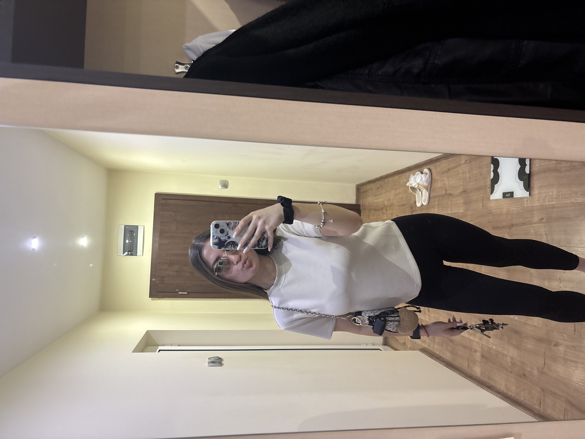A young woman stands in a hallway in Chirpan, Bulgaria, taking a selfie in a mirror. She is wearing a white t-shirt and black leggings. She is holding a set of keys in her right hand and a small handbag on a chain over her shoulder. A door is visible in the background, along with a pair of white shoes. The hallway has light-colored walls and a wooden floor.
