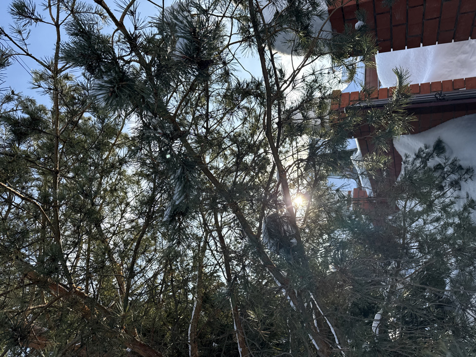 The scene depicts a winter exterior in Zhebrei, Russia. A large evergreen pine tree, with dark green needles and brown branches, occupies the majority of the frame, viewed from a low angle. Snow is present on various pine branches and clusters of needles. Bright sunlight filters through the upper and central portions of the tree, creating a prominent starburst lens flare in the lower-left quadrant of the image. The sky, visible through gaps in the foliage, is clear and light blue. In the lower right and bottom portions, a section of a red brick fence or gate pillar, topped with a white cap, is partially visible. Deep snowdrifts accumulate against the brick structure and on the ground, partially obscuring a dark metal gate or fence section. No human or animal subjects are present, and no discernible actions or interactions are occurring.