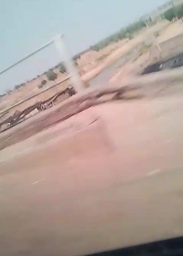 A car driving along a bridge is seen in a video shot from inside the car. The bridge has a white metal railing. Outside the bridge is a dry, desert-like landscape. The camera angle is canted. A watermark "SHOT ON PG5-" is in the lower left corner.
