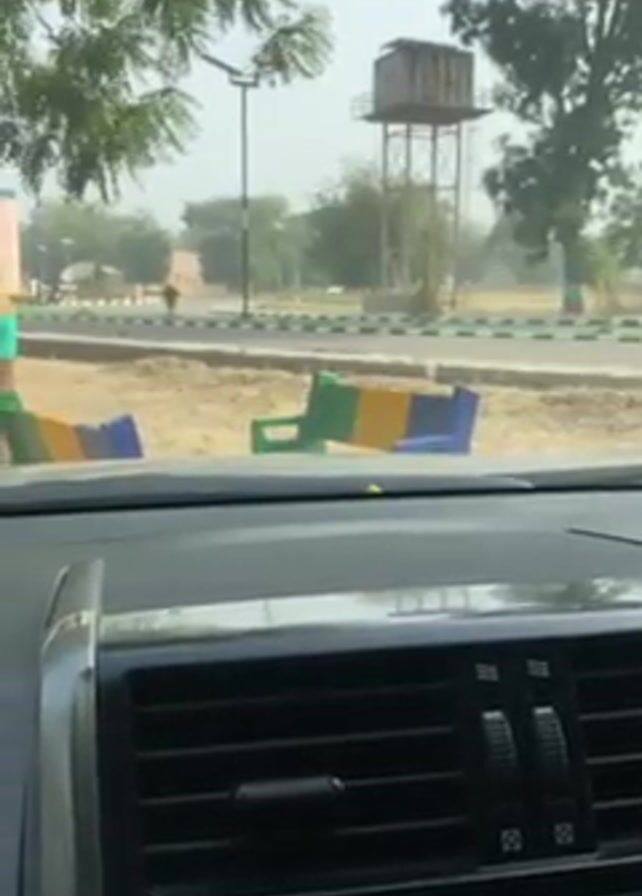 A static shot from inside a car shows a grassy area with a few trees and a water tower in the background. There are benches painted with bright colors, and a person is walking in the distance. The dashboard of the car is visible in the foreground, and the day appears bright and hazy.