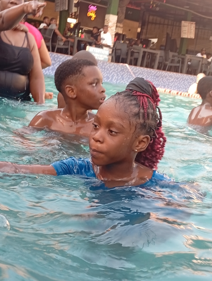 In a pool, a young girl with braided red-tinted hair and a blue shirt looks to the left. Behind her, a boy with short dark hair also looks left. Other people are partially visible in the water around them. Tables, chairs, and people sit on a patio with a colorful lit sign. The water is bright blue.
