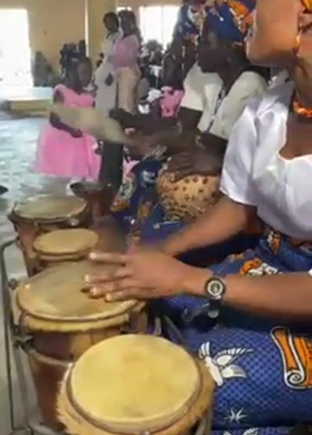 woman playing a set of five conga drums while singing in what seems to be an African setting. She wears a white blouse, a colorful blue and orange patterned skirt, a matching headwrap, and beaded necklaces. A watch is visible on her left wrist. Behind her, several other women sit in a row, some with similar attire, while a few children, including one in a pink dress, are dancing in the background. The room has a pale blue and pink draped ceiling and a slightly raised platform in the back.