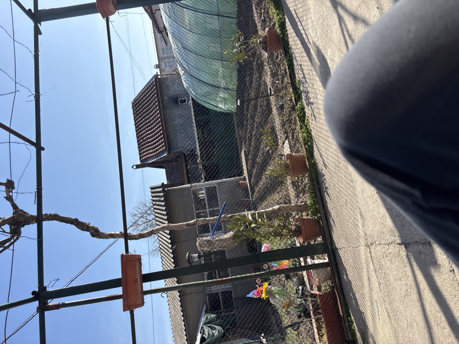 The image depicts an outdoor residential scene in Tsaratsovo, Bulgaria, viewed from a low, seated perspective. In the immediate foreground, the knees and upper thighs of a person wearing dark trousers are visible, obscuring the bottom portion of the concrete ground. The concrete surface exhibits strong, parallel shadow patterns cast by an overhead structure. The midground features a metal pergola structure with bare, gnarled vine branches entwined around its posts and crossbeams. An empty, rectangular terracotta-colored planter is attached to a vertical pergola post on the left. Behind this structure, a chain-link fence encloses a garden area. Within this fenced plot, the soil is tilled and largely bare. Several potted plants in brown terracotta pots are positioned along the fence line, at least three clearly visible, containing green foliage. On the left side of the garden, near the fence, colorful garden decorations are present, including a multi-colored pinwheel resembling a butterfly. An outdoor lamp is affixed to a metal post within the garden area. The background reveals multiple residential buildings under a clear, bright blue sky. To the left, a single-story building with a light-colored corrugated roof is partially obscured by the pergola and vine. To its right, a two-story house with a reddish-brown tiled gabled roof and a visible chimney stands behind the fence. Its walls appear to be grey concrete or stucco, with a dark area observed on one wall. A large, translucent green, semi-circular tunnel-shaped structure, consistent with a greenhouse, is situated behind the fence on the right side of the garden. Utility lines are visible against the sky above the houses. The scene is illuminated by strong daylight, casting distinct shadows across the foreground and midground.