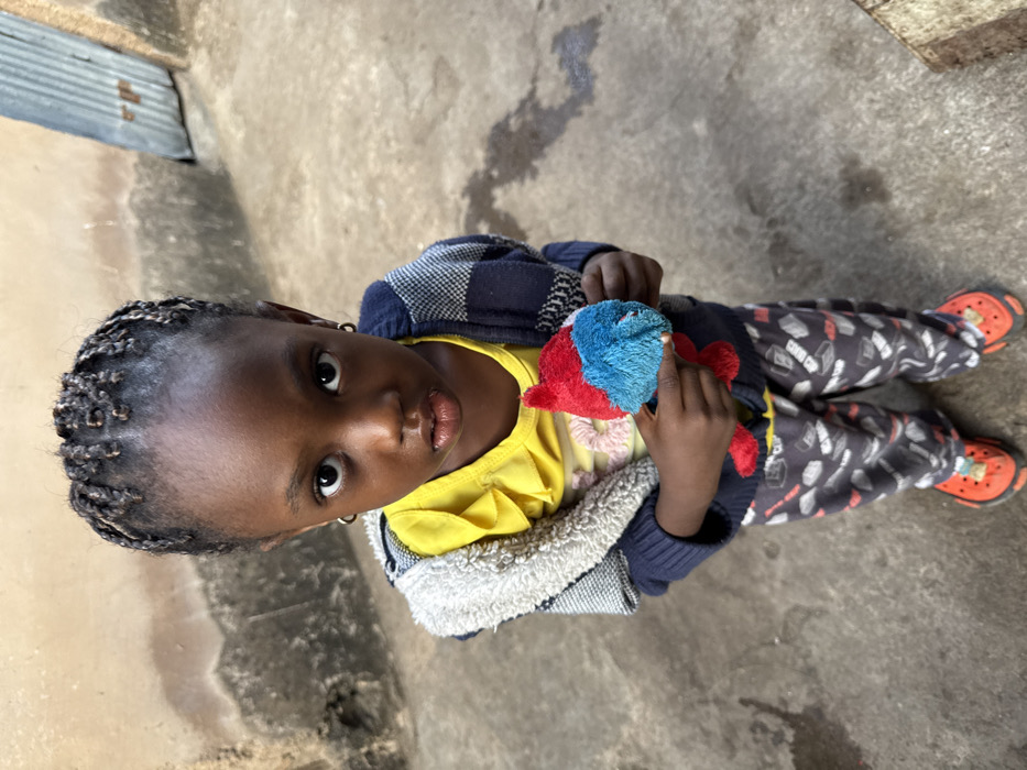 A young girl with braided hair looks up at the camera, holding a plush toy with red and blue colors
