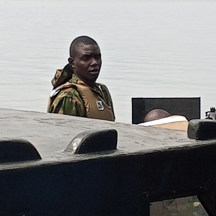This image depicts a maritime scene in Koko, Nigeria. In the foreground, the dark-colored hull or deck of a vessel occupies the lower portion of the frame. A dark-skinned male, with a short buzz cut, is positioned in the mid-ground, appearing partially submerged in water or situated low within a craft, with the water level reaching approximately his chest. He is wearing a camouflage long-sleeved shirt beneath a tan life vest. His head is turned slightly to his left, and his mouth is partially open. Behind this individual, to the right, a dark, rectangular panel is present, behind which the upper portion of a second individual's head, bald or with very short hair, is partially visible. The background consists of a calm, light-colored body of water.