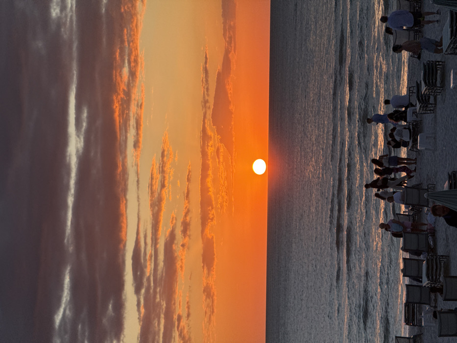 Pelican Bay, United States of America, is the location of this beach scene at sunset. A prominent, bright white sun disc is positioned low on the horizon, directly over the dark blue-grey ocean. The sky above the horizon exhibits a vibrant gradient of orange and red, transitioning to darker orange, purple, and grey hues with scattered cloud formations at higher altitudes. Gentle waves are visible near the sandy shoreline. Approximately 25 individuals are distributed across the beach. Many are silhouetted, forming small groups standing and facing the sunset, while others are seated in numerous beige-colored beach chairs arranged on the sand. Some chairs are empty or stacked. A closed beach umbrella is partially visible in the lower foreground. No specific interactions or detailed identifying features are discernible for the individuals.