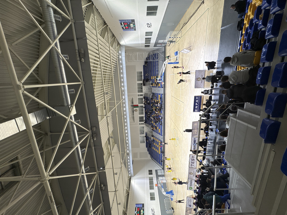 The image displays an interior view of a multi-purpose sports hall in Shumen, Bulgaria