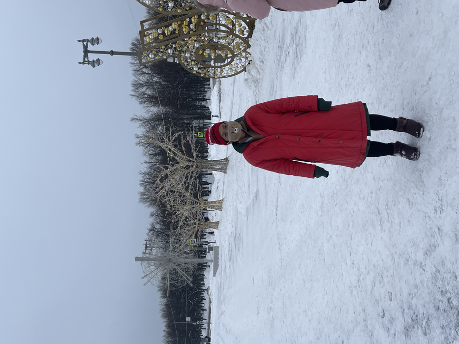 The image captures a wide outdoor winter scene, likely in VDNKh Park, Moscow, Russia. The ground is uniformly covered in snow and packed ice under an overcast, light grey sky. In the foreground, slightly left of center, a person stands facing the camera. They wear a long, knee-length, quilted red winter coat with a dark green lining visible at the collar and cuffs. Below the coat, black leggings or trousers and brown, fur-lined boots are visible. On their head, they wear a red knitted hat with a white pom-pom. They also wear glasses and a light brown face mask featuring a cartoon bear's facial features. The person's expression is neutral; they are not engaged in any specific action or interaction. To the far right, part of a second person is visible, wearing a pink winter coat. Only their right side, including an arm and a portion of their torso and leg, is within the frame. The background features several large, festive light installations and bare winter trees. From left to right: 1. A large, white, illuminated structure resembling a stylized snowflake or star stands on a concrete base. 2. Three decorative tree-like structures are illuminated with numerous warm white lights, appearing as solid light forms. 3. Partially visible on the right side of the frame is a large, ornate, gold-colored structure adorned with silver and gold spheres, resembling a grand sleigh or carriage. Beyond these installations, a line of bare deciduous trees stretches across the horizon. A black street lamp with two fixtures is visible in the upper mid-right. A cleared path or road, still covered in a thin layer of snow and ice, runs through the mid-ground. Faint figures of people are discernible in the distance near the treeline.