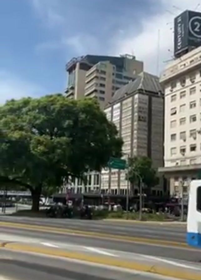 cityscape, likely an urban setting with tall buildings and a wide avenue