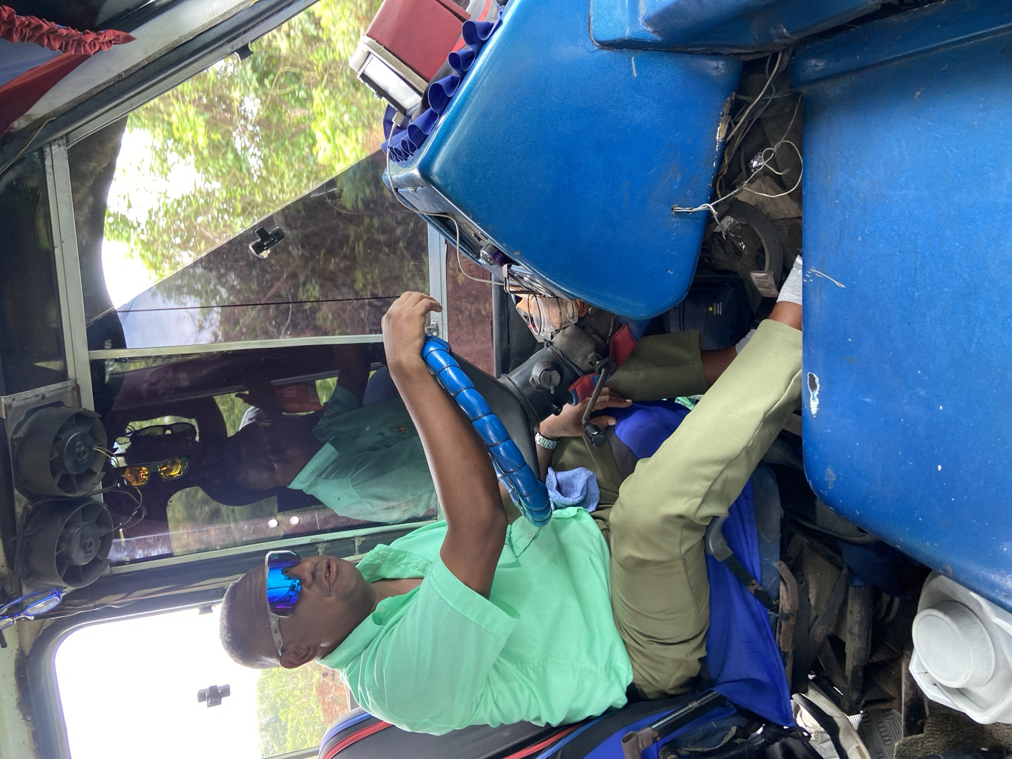 A man wearing a light green collared shirt, khaki pants, and blue sunglasses is sitting in the driver's seat of a vehicle, holding the blue-covered steering wheel. Reflected in the window behind him is another man wearing sunglasses and a light green shirt. The interior of the vehicle is crowded, with blue seats, exposed wiring, and two fans attached to the roof. The vehicle appears to be parked as greenery is visible through the window. There is no evidence in the image to suggest that the photo was taken in Rivero, Venezuela.