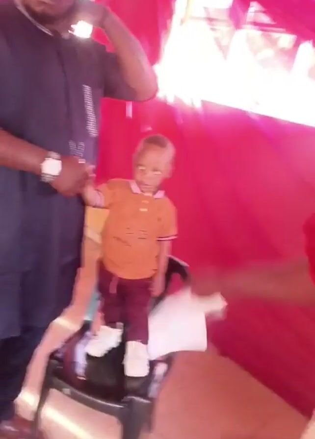 A man and a small child are the focus of this video. The man, who appears to be an adult male, is wearing a dark blue outfit with a traditional-looking hat, and a watch. He stands next to a small child, presumably a toddler, who is standing on a black plastic chair. The child is wearing a tan polo shirt with a design, burgundy-colored pants, and white sneakers. The man is holding the child's hand for stability. A hand holding papers is visible, though the papers are out of focus. The scene appears to be indoors, possibly at an event or party. Red fabric is draped in the background. The lighting is moderate.