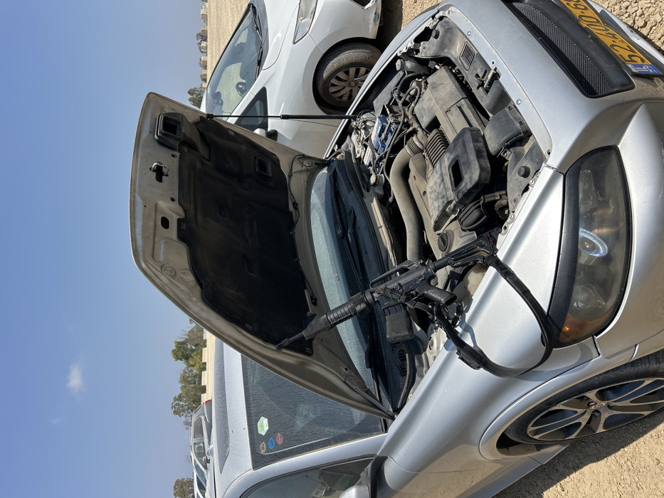 The scene, located in the Sdot Negev Regional Council, Israel, depicts a silver Volvo C30 hatchback parked on a light-brown, unpaved, dusty surface under a clear blue daytime sky with a single cloud. The vehicle's hood is open, revealing a dusty engine compartment. A black M4-style carbine rifle, equipped with an inserted magazine and a sling, rests on the engine bay, leaning against the propped-open hood. The front of the Volvo displays a yellow Israeli license plate. To the immediate right, a white minivan is partially visible. The background features additional parked vehicles, scattered trees, and agricultural fields containing large, round hay bales. No individuals are visible in the image.