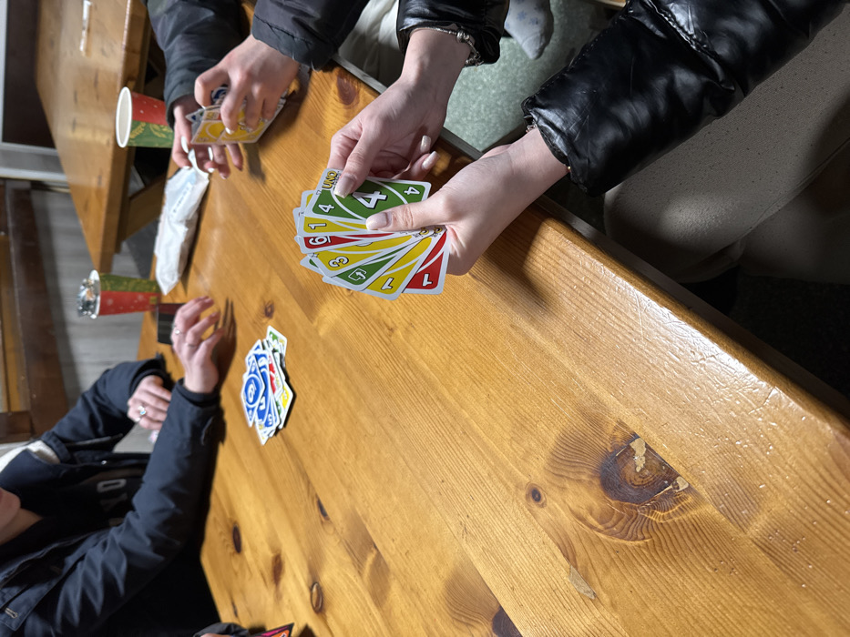 The scene depicts an indoor social gathering, likely in Bistritsa, Bulgaria, though the precise location within the city is not discernible from the image. Four individuals are seated around a light-colored wooden table, engaged in playing the card game Uno. In the foreground, a person's hands hold a fan of Uno cards, specifically showing a Red 1, Yellow 3, Green 6, Green 4, and a Red 4 marked "UNO". This individual wears a black puffer jacket and light-colored trousers, with a silver-colored bracelet on the left wrist. Their fingernails are painted a light color. To the immediate right, another person's hands are also holding Uno cards, partially obscured. A third person is visible on the far left, with their hands resting on the table near a central discard pile of Uno cards. This individual wears a dark jacket and rings on their fingers. On the wooden table, which exhibits visible wood grain and knots, a central pile of discarded Uno cards is present. Further back on the table, two festive-themed paper cups (one red, one green, possibly Christmas-themed) are visible, one with a metallic lid, along with a white packet or napkin. In the background, another wooden table is partially visible, and the wall features light-colored vertical paneling.