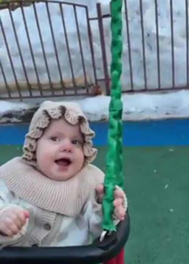 A baby, dressed in white and beige heart-patterned clothing and a matching bonnet, is on a swing at a playground. The swing has green rope supports and a red and black seat with a safety bar. A hand pushes the swing, and the baby laughs and smiles while being swung. There is snow piled up behind a metal fence in the background. The playground surface is green and blue.