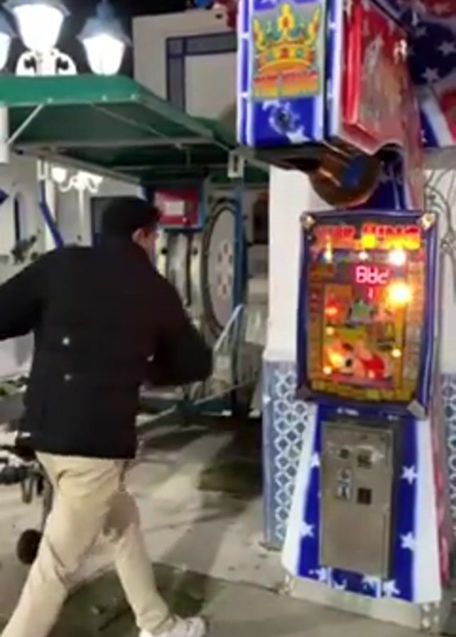 A man punches a punching machine in an outdoor setting at night. The man is wearing a black jacket, light-colored pants, and white shoes. The punching machine is decorated with patriotic colors and has a display screen showing the score. The machine is labeled "The King" and displays 100000. After the punch, the man gestures towards the machine with a serious expression. Other lights and carnival-like structures are visible in the background.