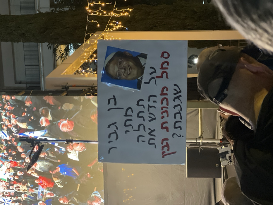 A white sign with Hebrew text and a headshot of a man in glasses is visible