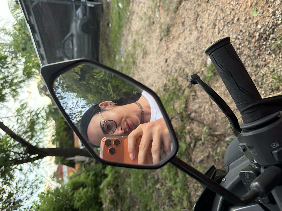 - "The image displays a female individual taking a selfie, reflected in the left rearview mirror of a motorcycle, located in Benoa, Indonesia" by FM-rjspp2, licensed under CC BY 4.0