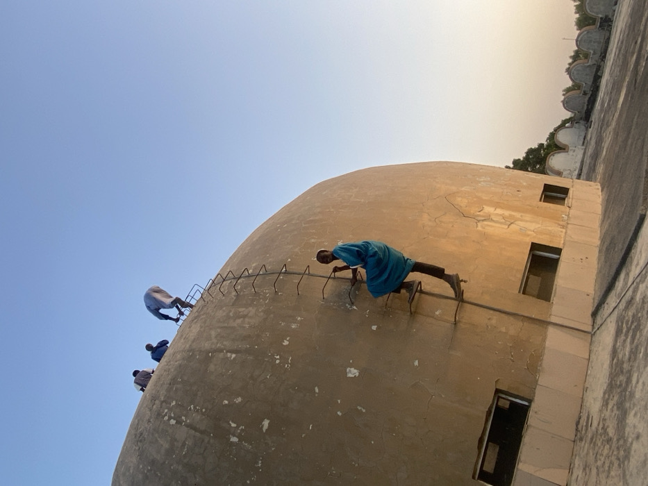 This image depicts a large, light-brown, concrete dome-shaped building in Barako, Nigeria, under a clear, pale blue sky. A metal ladder, consisting of vertical bars and horizontal rungs, is affixed to the curved surface of the dome, extending from its base towards the apex. Four adult males are visible on the dome. In the mid-ground, a man wearing a blue robe (jalabiya), dark trousers, and sandals is actively climbing the ladder, ascending with his right foot on a rung and left leg bent. He is turned slightly towards the viewer, exhibiting a smile. Above him, closer to the dome's crest, three other men are positioned. One man in a light-colored robe is seen from behind, bent over, appearing to secure or interact with the upper section of the ladder or the dome's surface. Two other men are partially visible further up the dome, one in a dark garment and another in a light blue garment, both observing or positioned near the dome's highest point. The dome's surface shows signs of wear, including visible cracks and areas of discoloration. Below the ladder, on the lower section of the dome, multiple rectangular window openings are present. The immediate foreground shows a flat concrete rooftop area with a decorative, curved parapet wall extending into the distance on the right. Trees are visible on the horizon line beyond the parapet. The lighting suggests late afternoon or early morning.